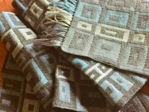 A sneak peek at Marian’s blue and gray double woven table runner which will be at the Art for the Home, Body and Soul annual sale at the Guild House.