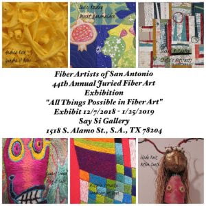 We are excited to announce the Fiber Artists of San Antonio 44th Annual Juried Fiber Art Exhibition. This year the Exhibition will take place at Say Si Gallery, 1518 S. Alamo St, S.A., TX 78204. The Exhibition will begin December 7th, 2018 and run through January 25, 2019. Whether you are an artist whose medium is fabric/fiber, or an art enthusiast who welcomes the opportunity to engage in appreciating art quilts, weaving, art to wear fashions, dolls & other fiber art sculptures, we invite you to participate in this event.