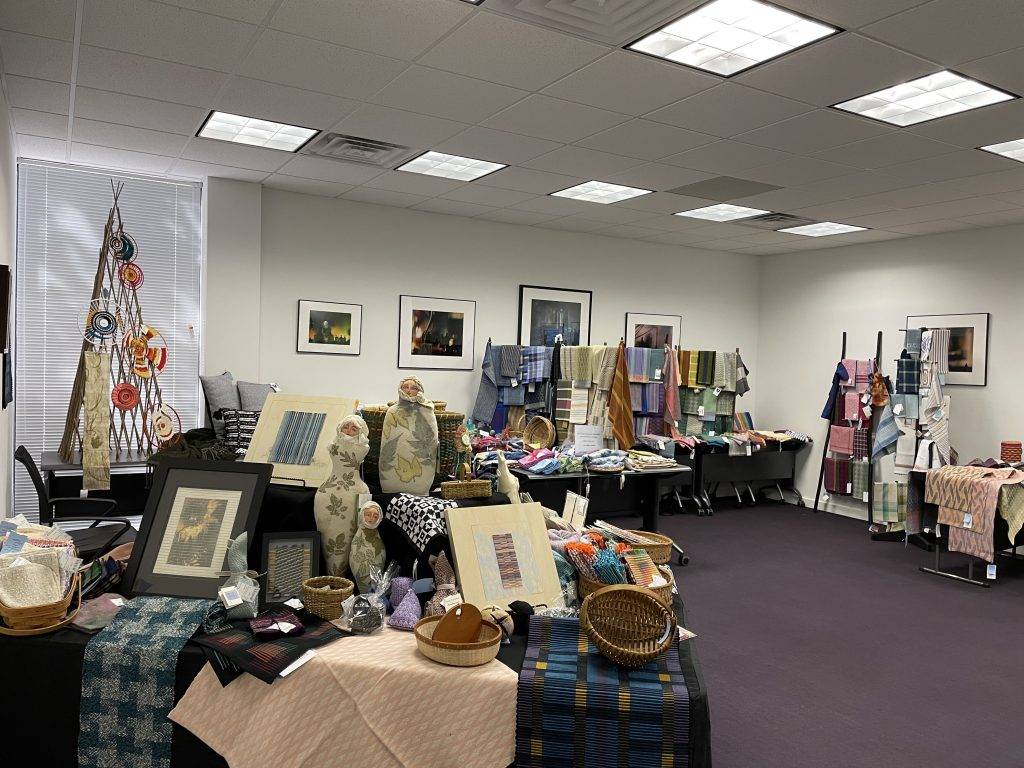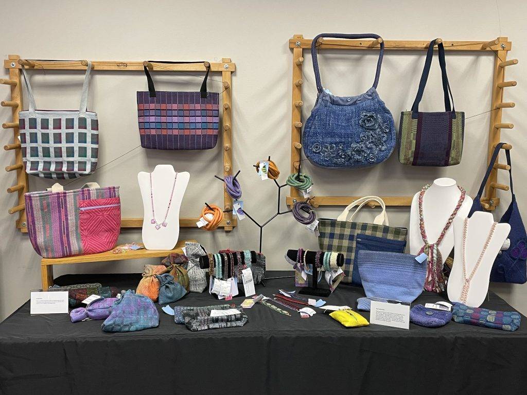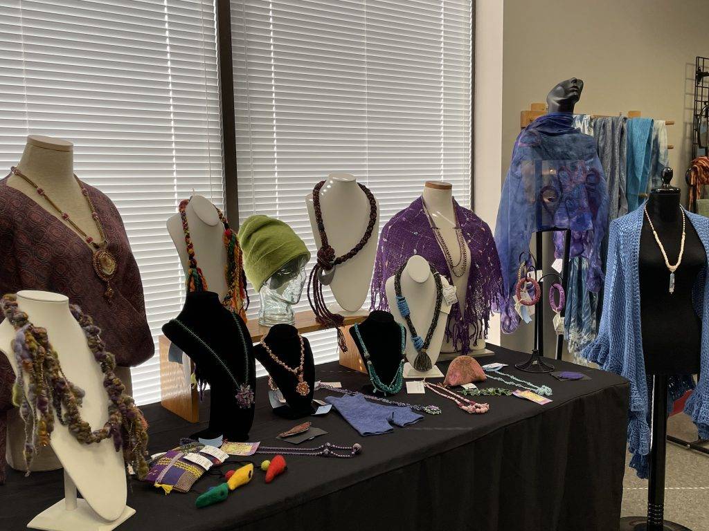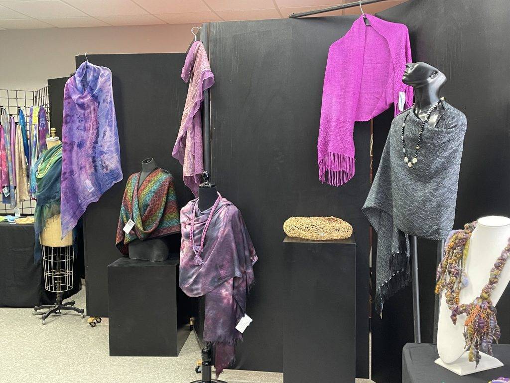 Beautiful handwoven and dyed silk scarves, jewelry and more – two rooms filled with handmade items.