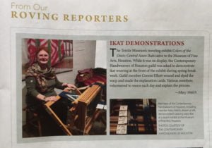 This article appeared in the September/October 2017 issue of Handwoven on page 7. Mary is shown at the Houston Museum of Fine Arts demonstrating how ikat is woven. CHH also held a dyeing session for the curator of the show in order for them to have samples for display along side the “Colors of the Oasis: Central Asian Ikats” exhibit. Connie prepared the ikat warp to be woven in the demo and the in-progress warps that helped museum visitors understand the many steps in the process.