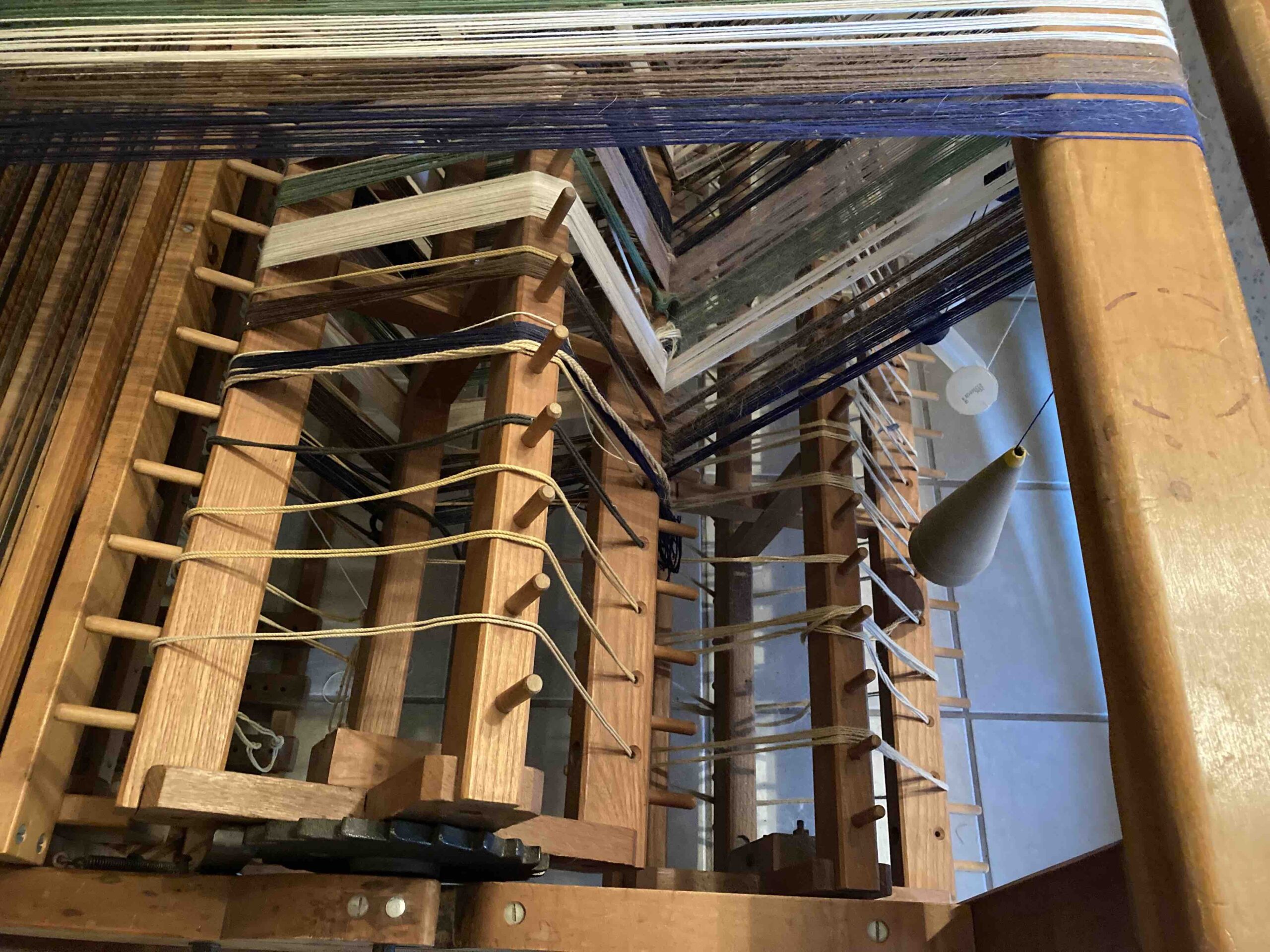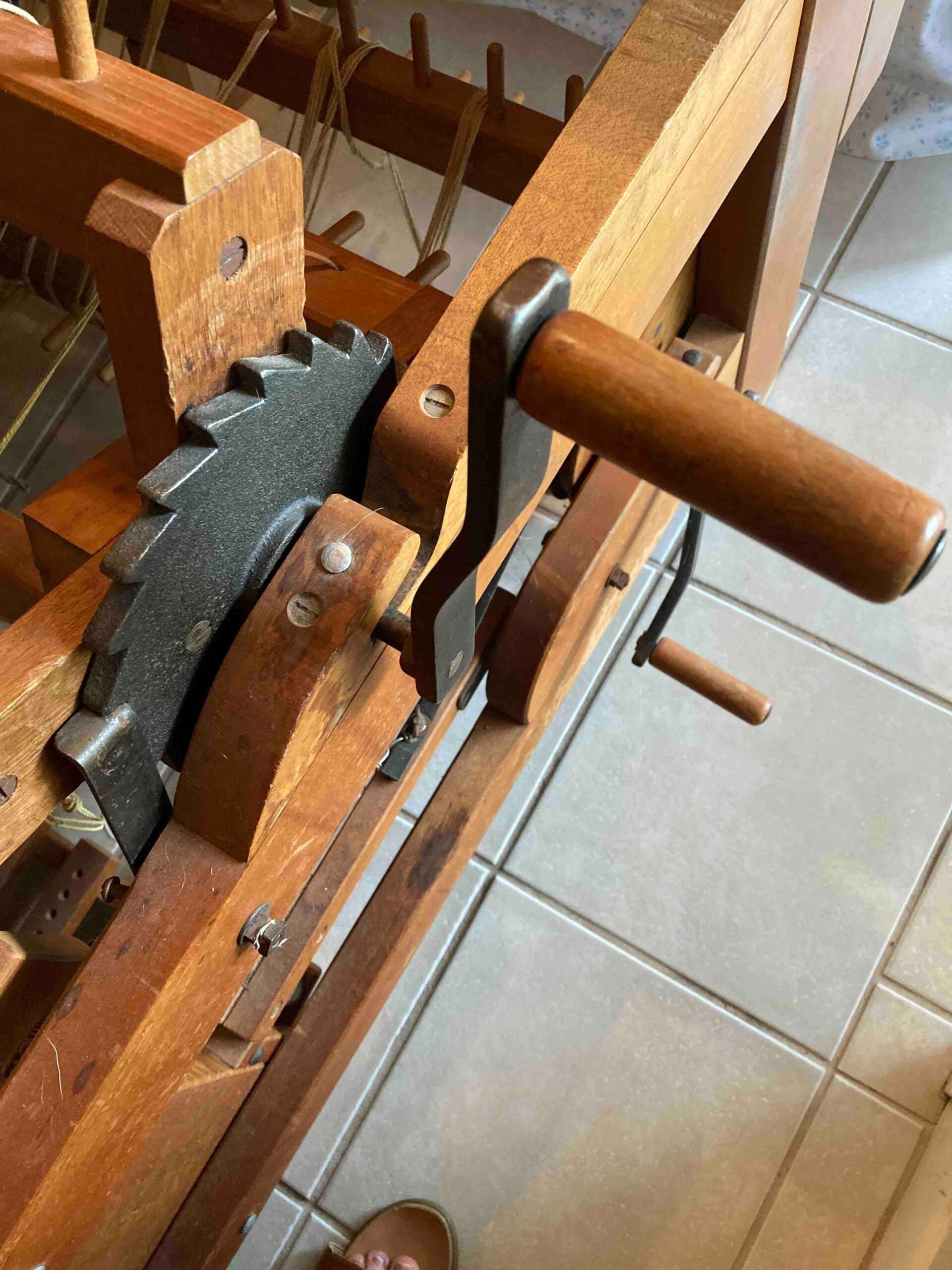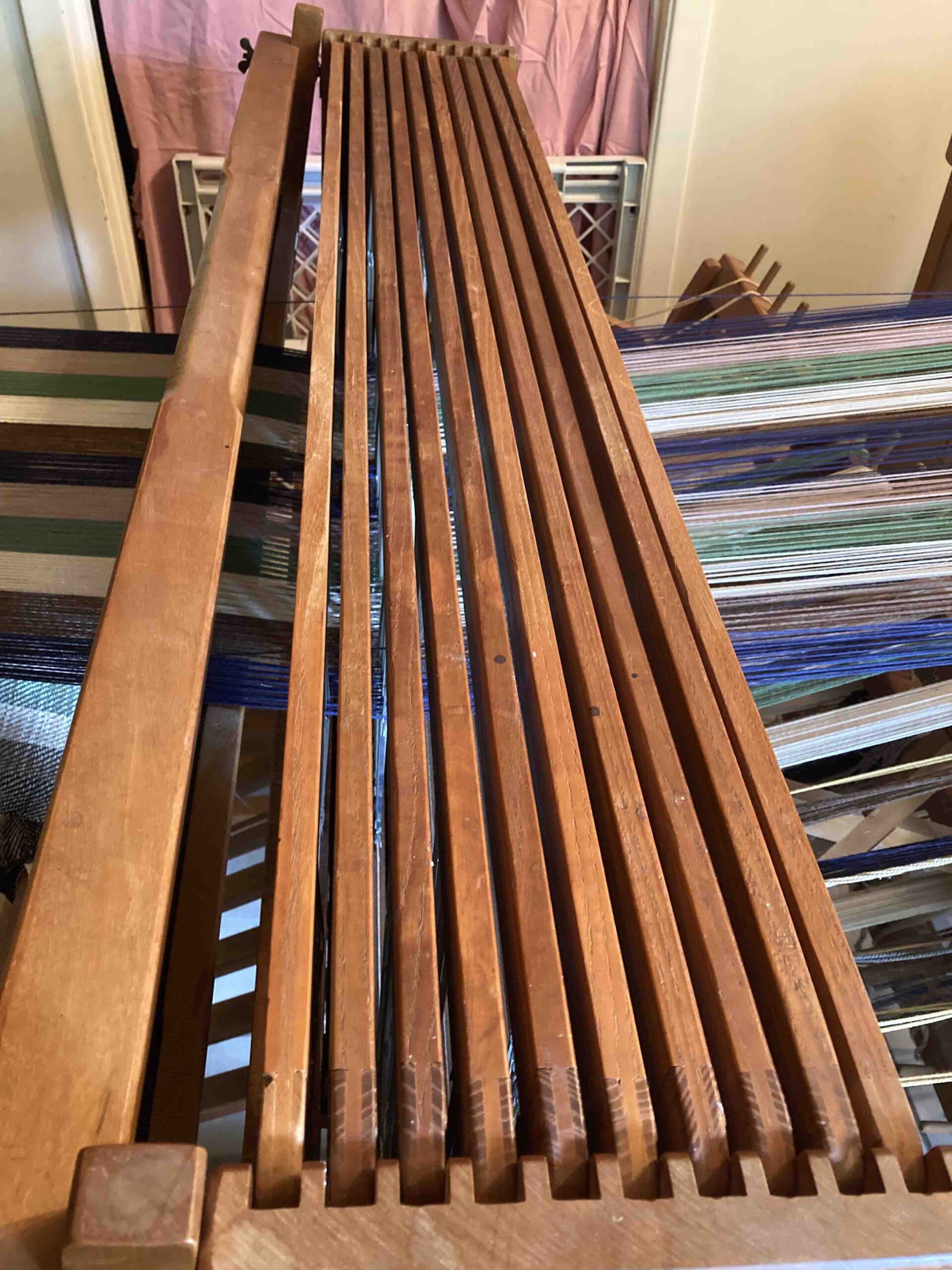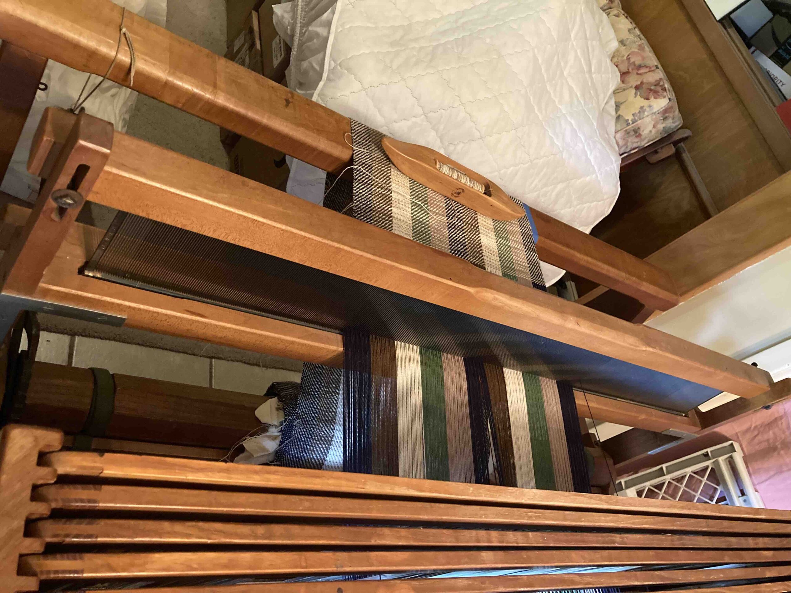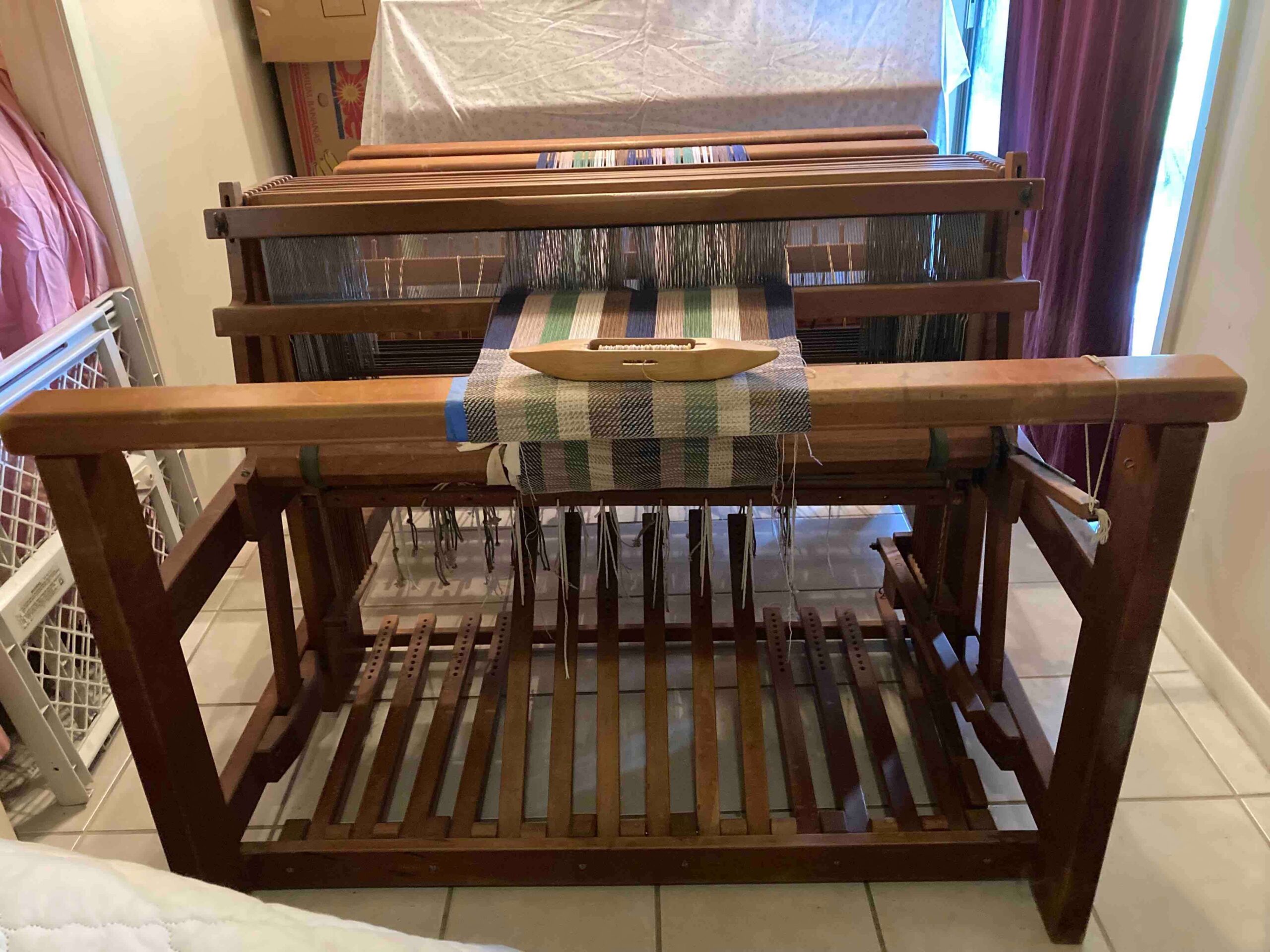 Solid 45” 10H 13T Gilmore loom for sale. Ratchet and friction brakes, 2 sectional warp beams, 1 12 dent reed, 1 shuttle. W 51”; H castle 38”; H front and back beams 33”; L 59”; upgraded w/ Texsolv treadle tie ups and arrows, cushion strips, warp beam pins. Paperwork/receipts from Gilmore Looms, Stockton, CA. Price $600. Moving out of state. Contact Sue in College Station, TX if interested and/or w/questions: sue.collaborate@gmail.com.