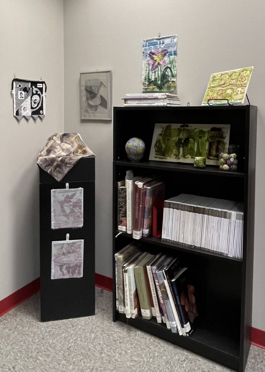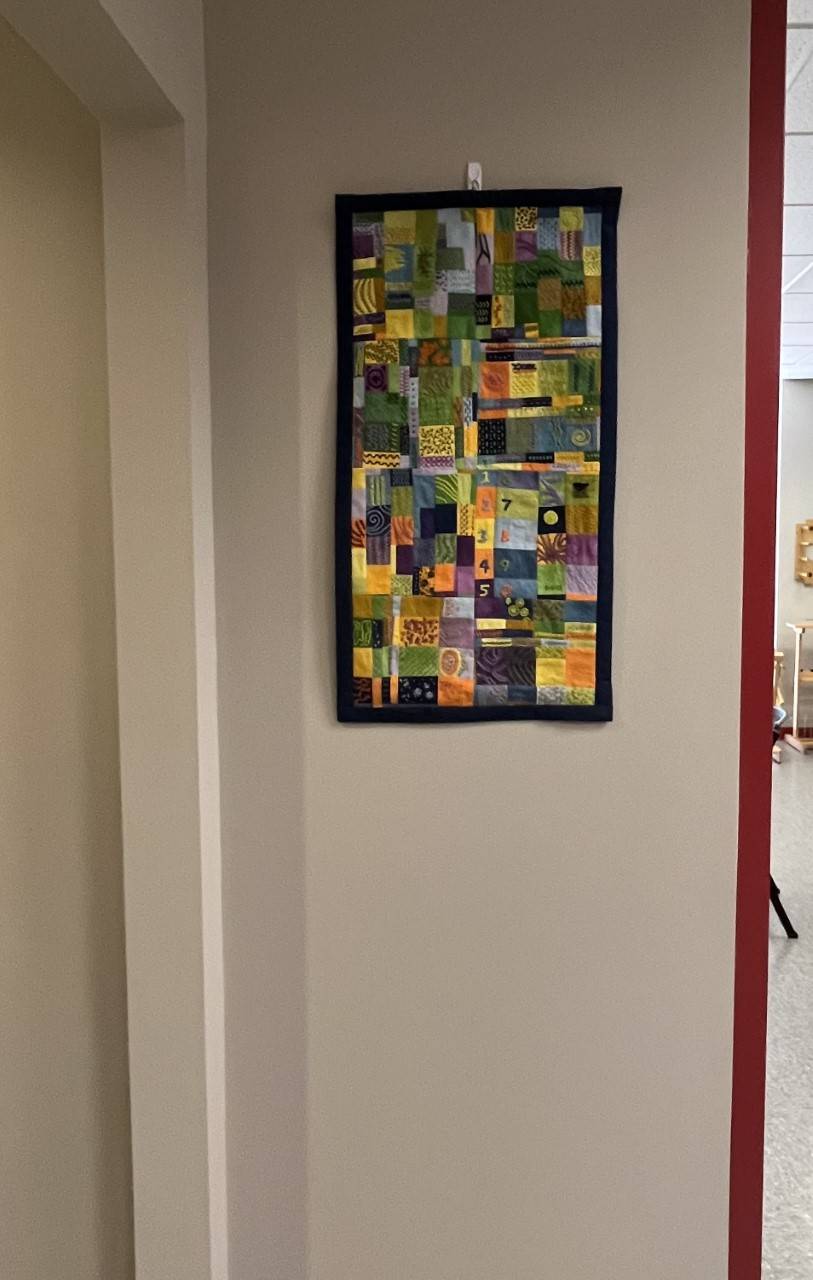 She follows the Pintangle.com blog and has participated in the “Take a Stitch Tuesday” (also known as TAST) challenge for many years. Several of the pieces exhibited are the result of those challenges. The earliest one is the long green one in the bookcase. Diane is also a member of the Stitch Club, organized by TextileArtist.org, a community of 60,000 artists. The fabric collage pieces on the wall are examples from tutorials there.