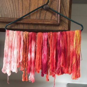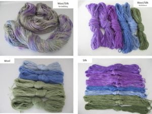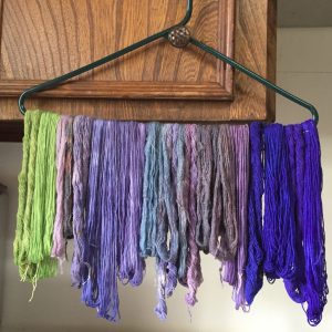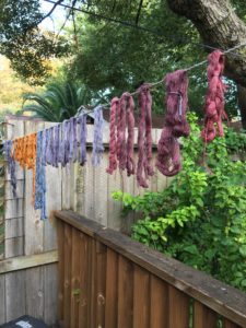 These two photos above are of Diane’s rinsed out silk and wool yarn skeins. The photo below is of Quealy’s skeins hanging out in her garden.