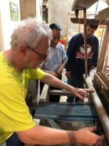 When I was in Ecuador we visited a weaver outside of the town of Otavalu and he insisted that I weave on his loom. I was terrified that I’d break a thread or something, but it all went well. It was a very old loom in a fairly dark space, with just a couple of looms and a huge warping mill, that was at least 5 feet tall. I don’t speak Spanish and no one there spoke English, but it was easy enough to figure out what was going on.